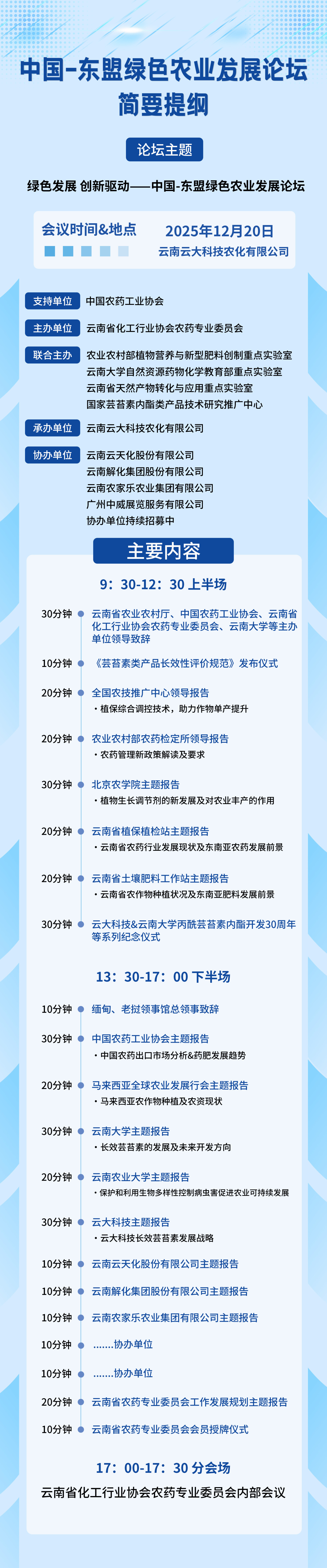 为深入贯彻绿色农业发展理念,积极响应国家“十五五”规划中对粮食安全与农业现代化的战略要求,共同探索粮食产能提升的新路径,由中国农药工业协会支持,云南省化工行业协会农药专业委员会、农业农村部植物营养与新型肥料创制重点实验室、云南大学自然资源药物化学教育部重点实验室、云南省天然产物转化与应用重点实验室、国家芸苔素内酯类产品技术研究推广中心联合主办的“中国-东盟绿色农业发展论坛”兹定于2025年12月20日在云南昆明云大科技农化有限公司举办。(地址:云南省昆明市晋宁区二街工业园云南云大科技农化有限公司)